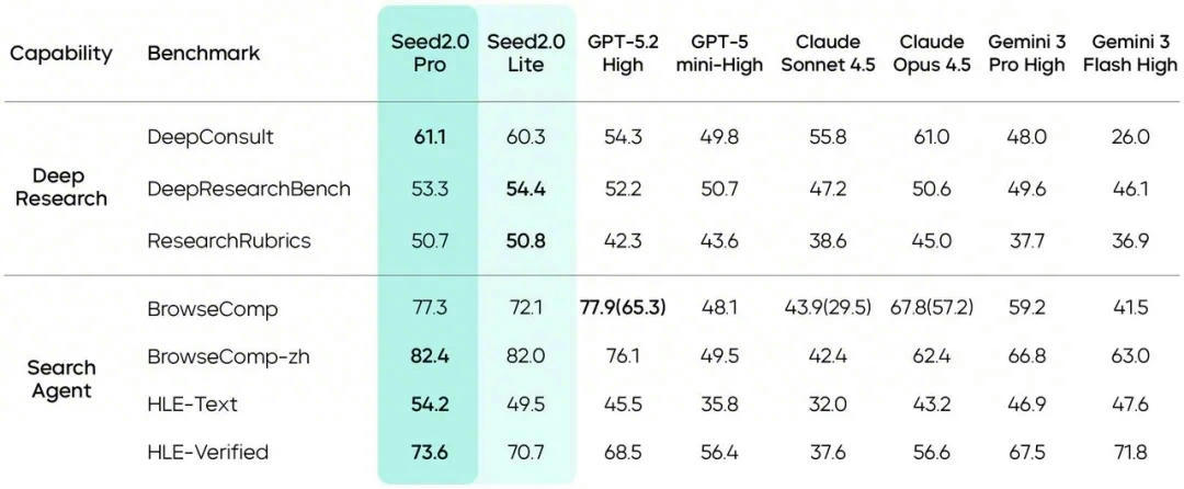 As evidenced by its foundational Agent capability scores, Seed2.0 demonstrates outstanding performance in long-chain tasks. It is particularly adept at continuously executing sequential workflows such as "retrieving information, making summaries, and drawing conclusions". In search and deep research tasks, Seed2.0 achieved high scores across seven evaluations including BrowseComp-zh and HLE-text, demonstrating its advancement capabilities and stability in research tasks.