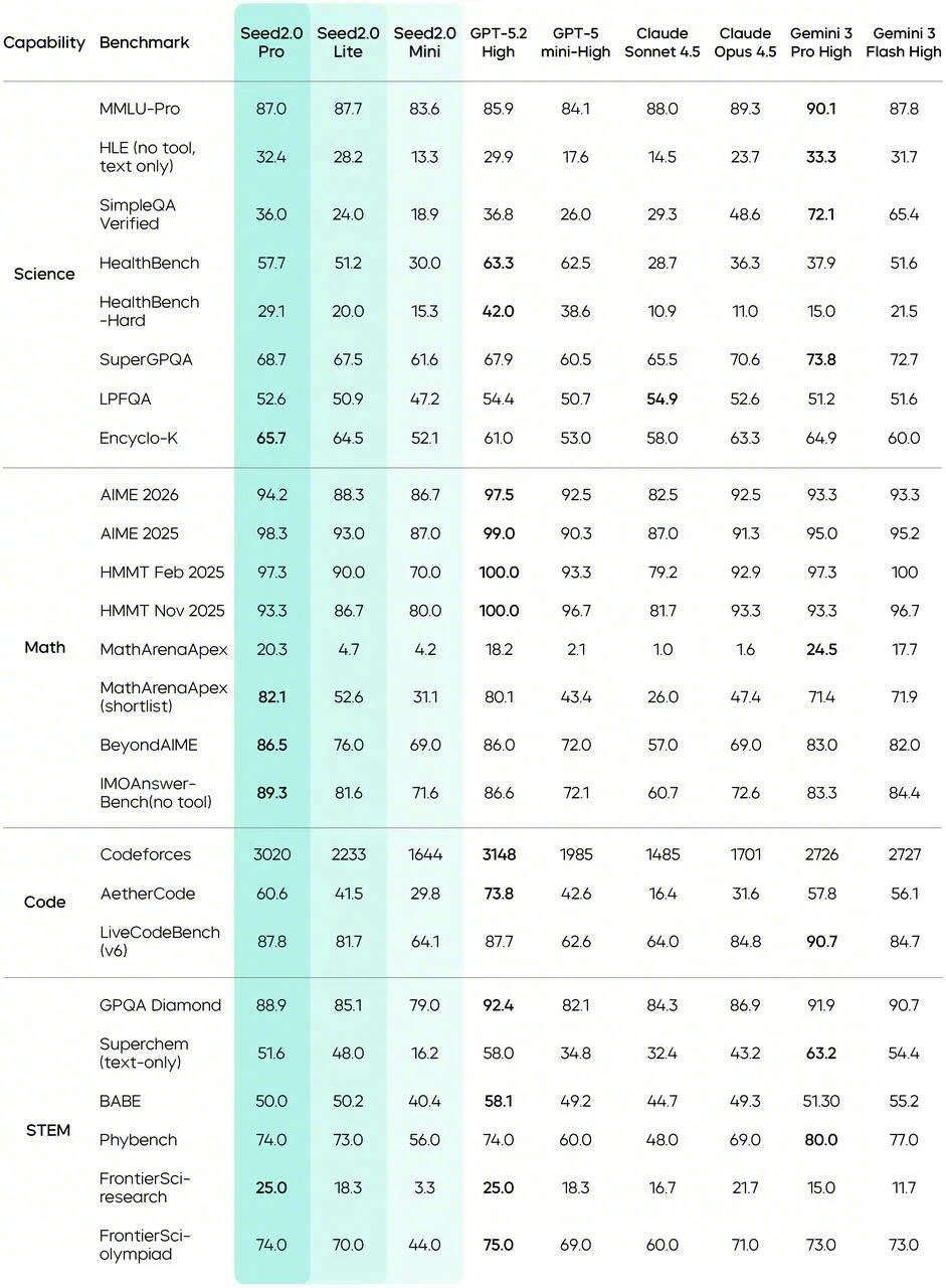 Seed2.0 first addresses this challenge by systematically strengthening knowledge in long-tail domains. Seed2.0 Pro has scored higher than GPT-5.2 on SuperGPQA. Its overall performance in the scientific field is on par with Gemini 3 Pro and GPT-5.2.