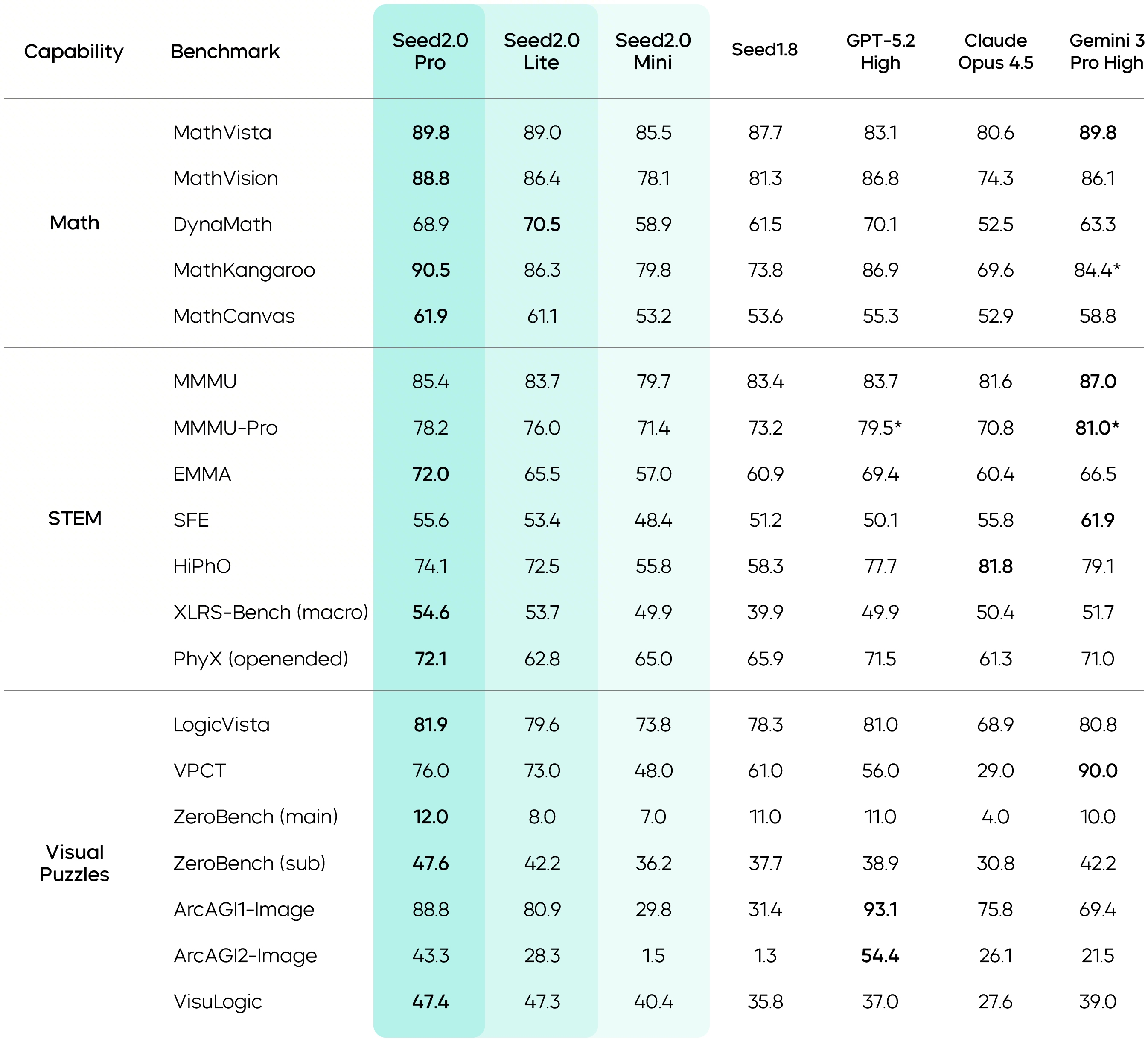 Seed2.0 delivers a comprehensive upgrade to multimodal capabilities, reaching industry-leading performance across a wide range of visual understanding tasks. It shows especially strong performance in visual reasoning, perception, spatial reasoning, and long-context understanding. Seed2.0 Pro achieves top scores on most major benchmarks.