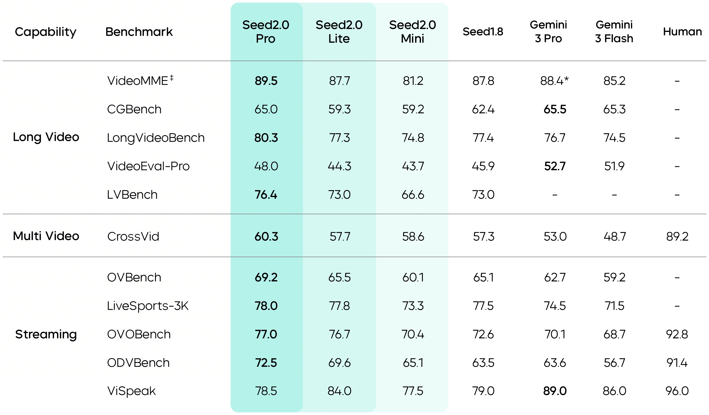 For video scenarios, Seed2.0 strengthens its understanding of temporal sequences and motion perception. It ranks among the leading players on key benchmarks, including TVBench, TempCompass, and MotionBench, and surpasses human-level performance on EgoTempo. This reflects more stable and precise capture of changes, actions, and rhythm, translating into stronger engineering robustness and real-world readiness.