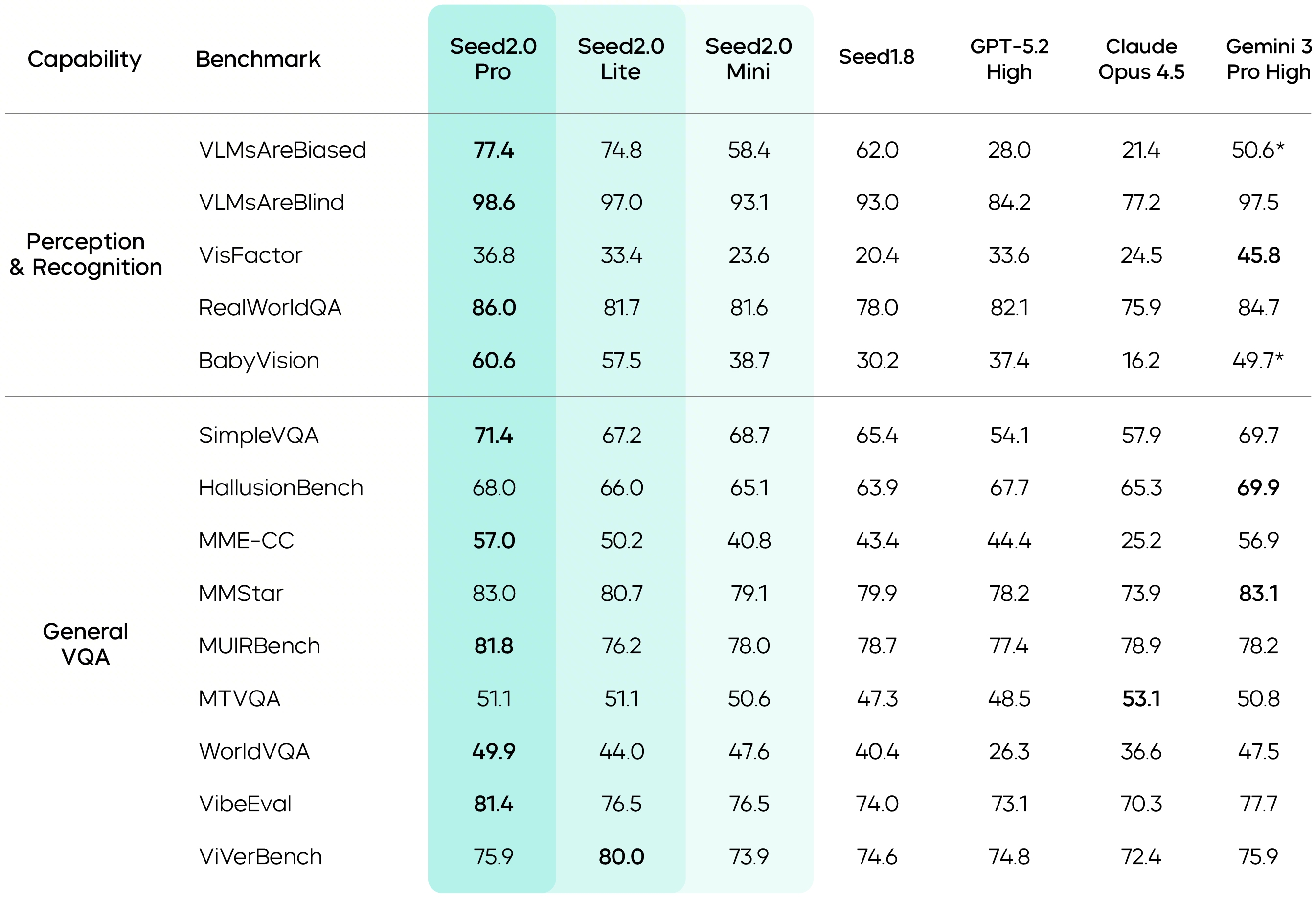 Seed2.0 的视觉感知能力进一步升级。在 VLMsAreBiased、VLMsAreBlind、BabyVision 等基准中,Seed2.0 取得了业界最高分,说明它在面对不同类型的视觉输入时,仍能保持准确且可信的感知和判断能力。