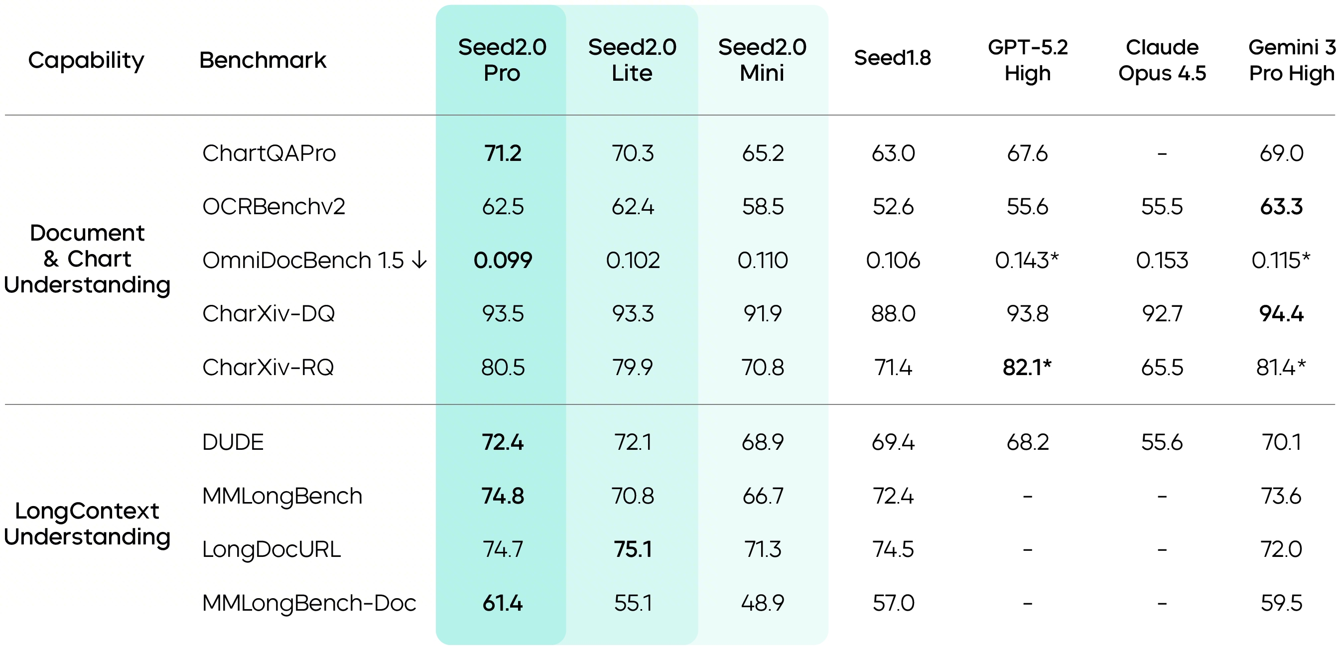 同时,在长上下文理解方面,Seed2.0 在 DUDE、MMLongBench 与 MMLongBench‑Doc 上均取得业界最佳分数。