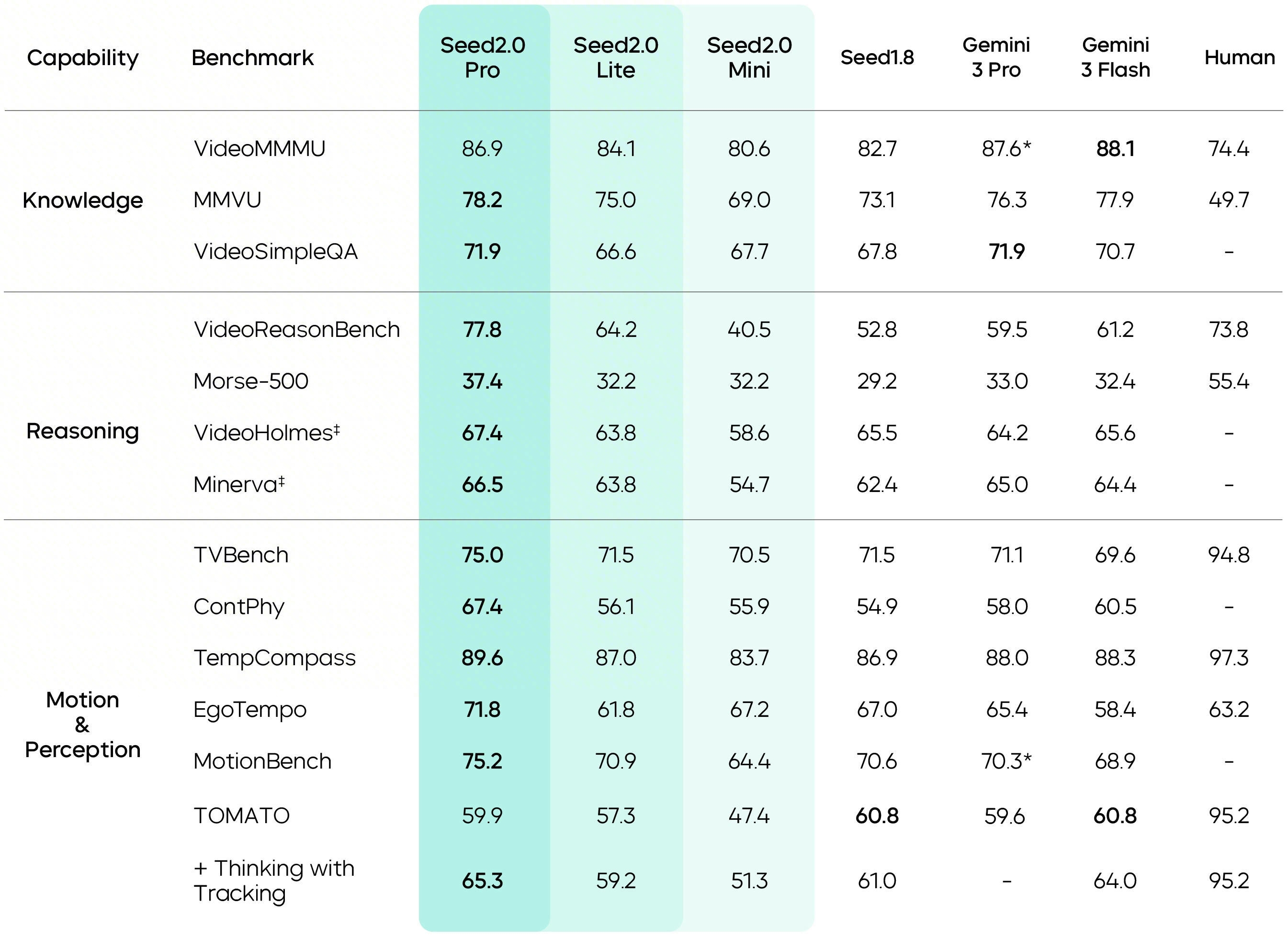 面对视频场景,Seed2.0 强化了对时间序列与运动感知的理解能力,在 TVBench、TempCompass、MotionBench 等关键测评中处于领先位置,且在 EgoTempo 基准上超过了人类分数,表明它对“变化、动作、节奏”这类信息的捕捉更为稳定,在工程侧可用性更高。