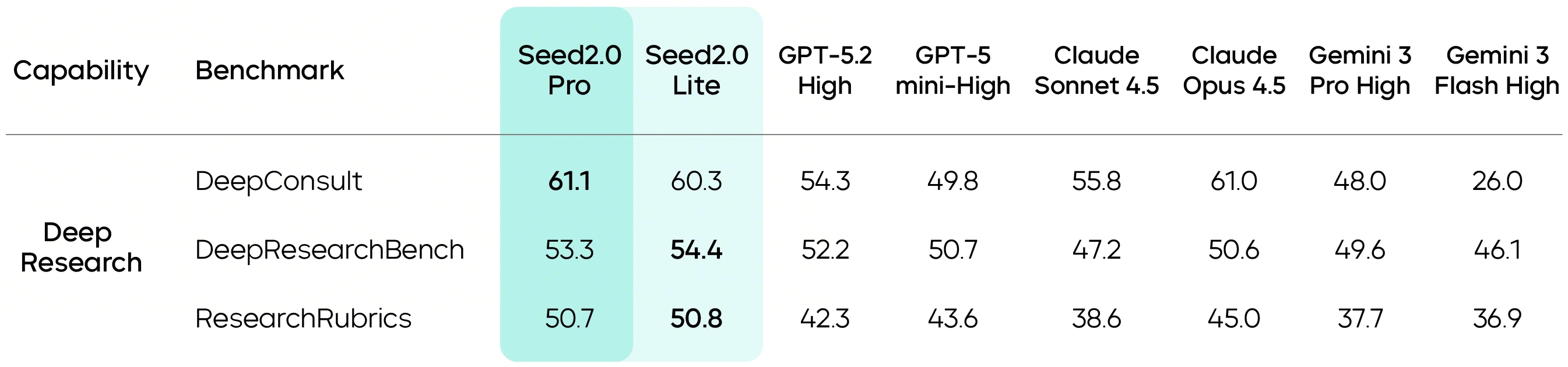从基础 Agent 能力的得分来看,Seed2.0 在长链路任务中表现突出,尤其擅长连续完成“找资料、做归纳、写结论”等连续工作流。深度研究任务中,Seed2.0 Pro 在相关的三项评测上均取得最高分,展现出在研究型任务里的推进能力与稳定性。