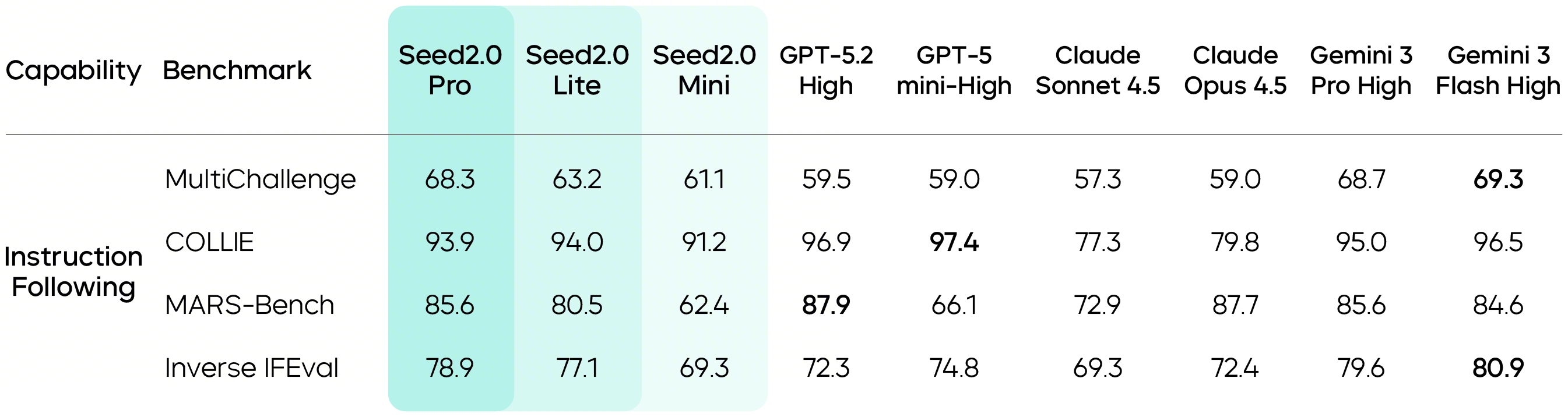 Seed2.0 还重点强化了指令遵循能力。相关评测显示,Seed2.0 可保持较强的一致性与可控性,这为其作为 Agent 模型在长链路、多步骤任务中严格按约束条件执行奠定基础。