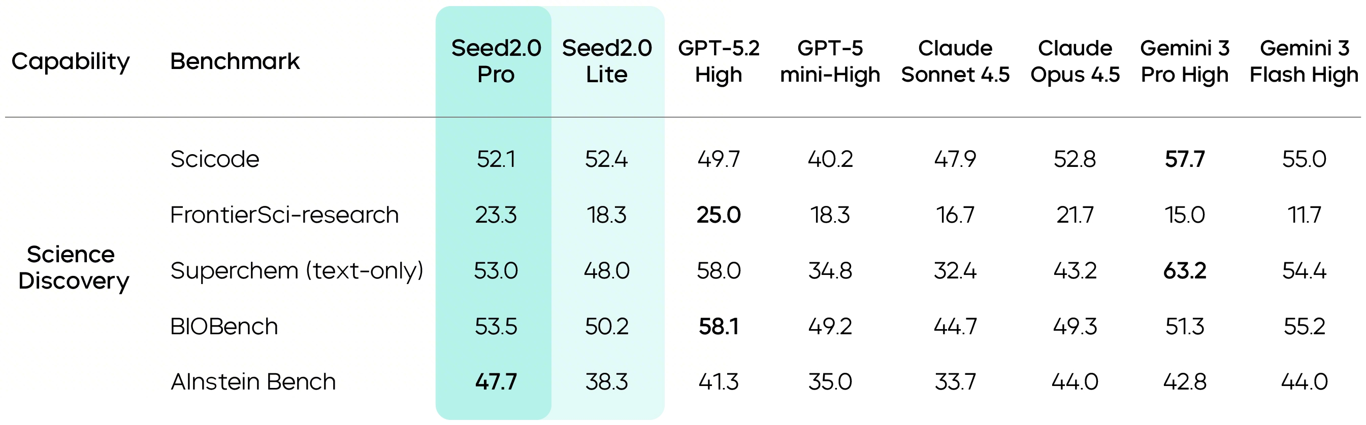同时,Seed2.0 Pro 在 FrontierSci‑research 等前沿科研基准上表现强劲,并在 AInstein Bench 上领先,体现出在科学发现场景中较强的假设驱动式推理能力。