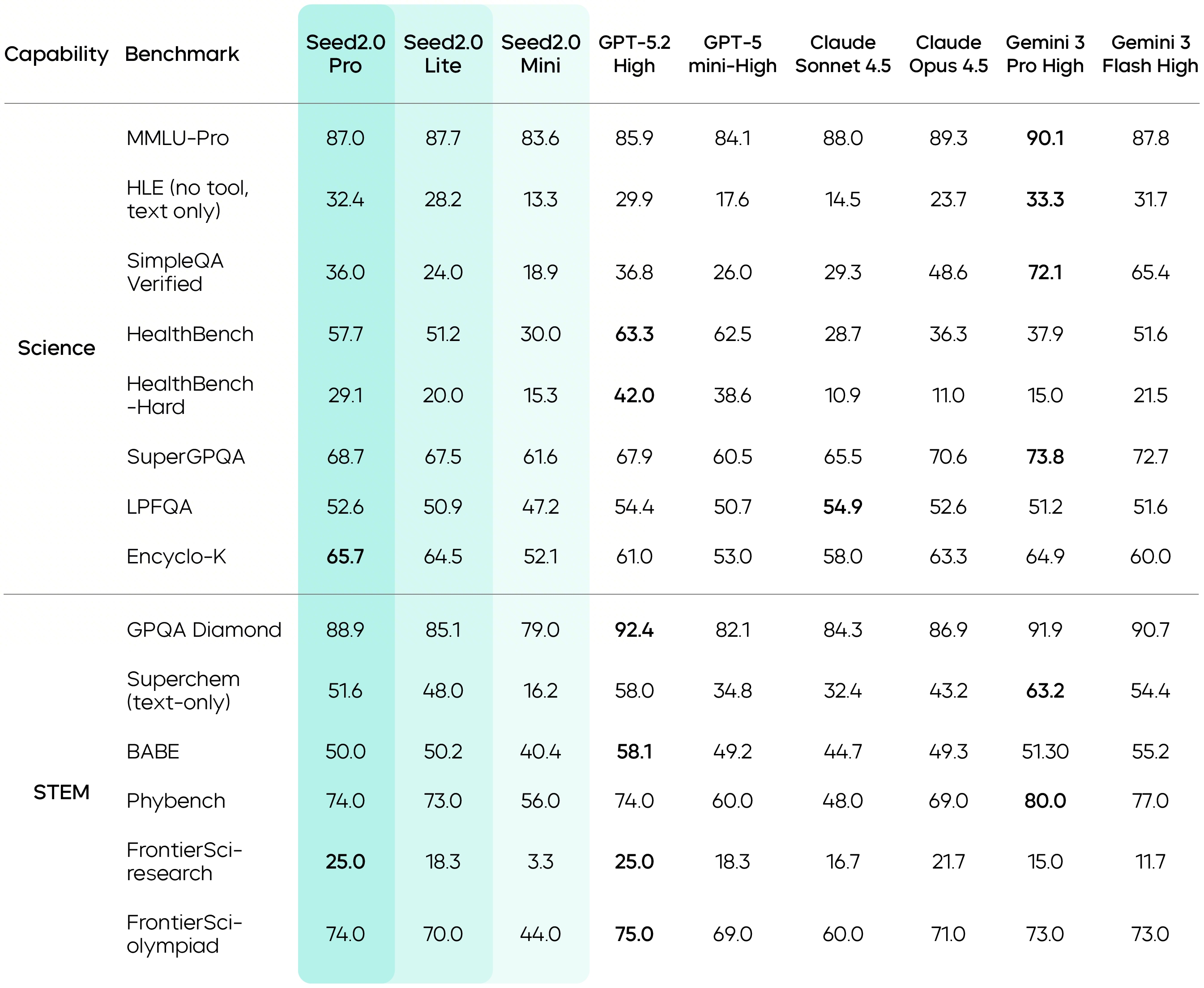 Seed2.0 首先通过系统性加强长尾领域知识来应对这一难题。Seed2.0 Pro 在 SuperGPQA 上分数超过 GPT-5.2,并在 HealthBench 上拿到第一名,其在科学领域的整体成绩与 Gemini 3 Pro 和 GPT-5.2 保持相当水平。