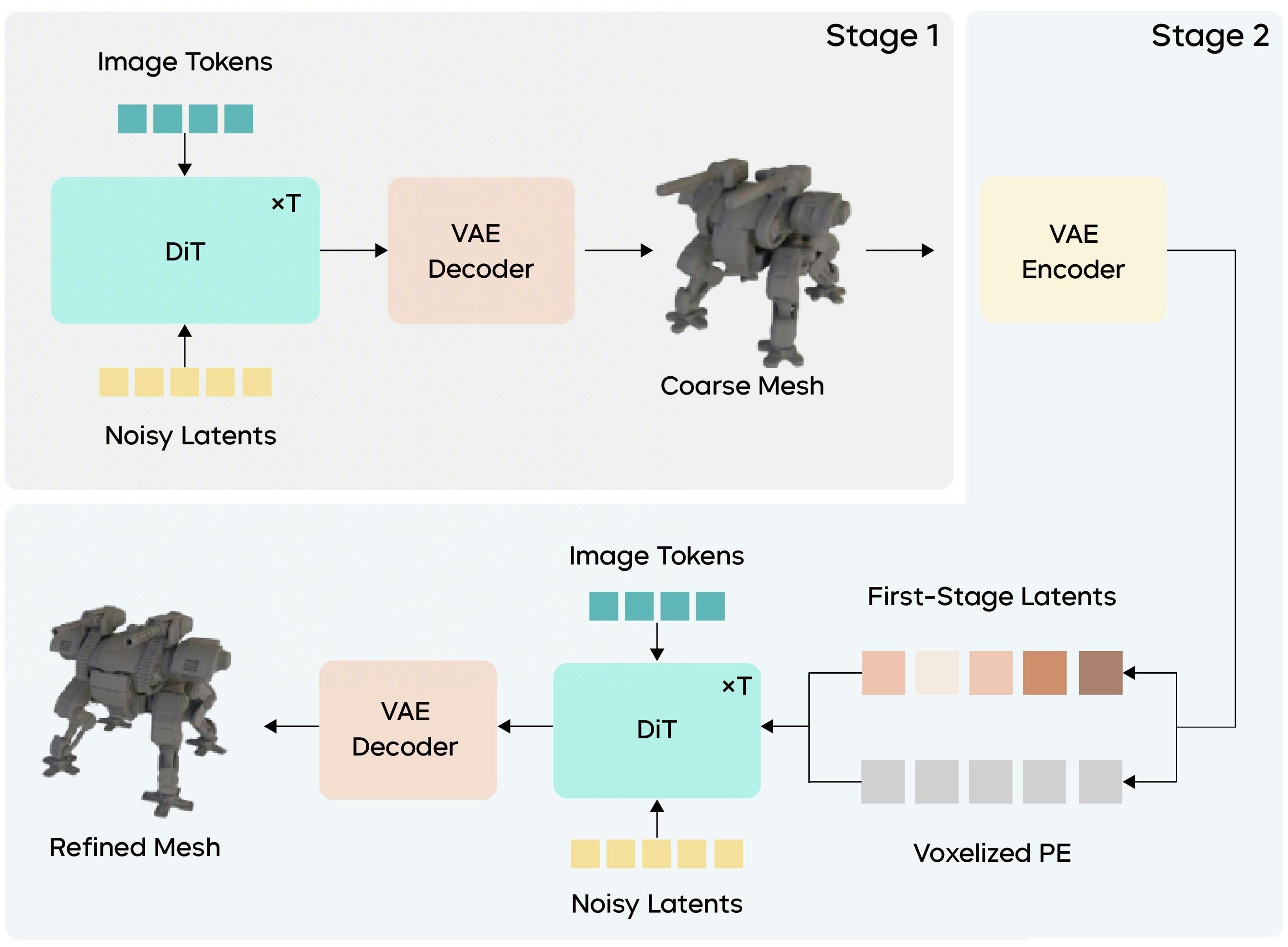 Stage 1: coarse geometric structure generation. The model uses a DiT with a larger parameter scale to generate coarse-grained geometric structures from the input image, establishing the overall topological relationships and spatial layout.