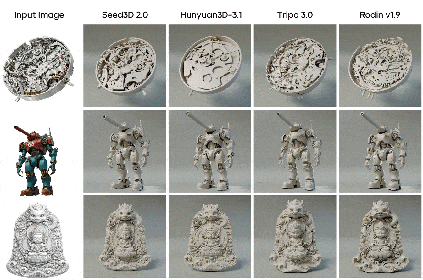 As shown in the figure below, qualitative comparisons with leading 3D generative models demonstrate that Seed3D 2.0 significantly outperforms baseline methods in rendering fine edges in complex geometries, generating thin-walled structures, and maintaining fidelity to the input image.