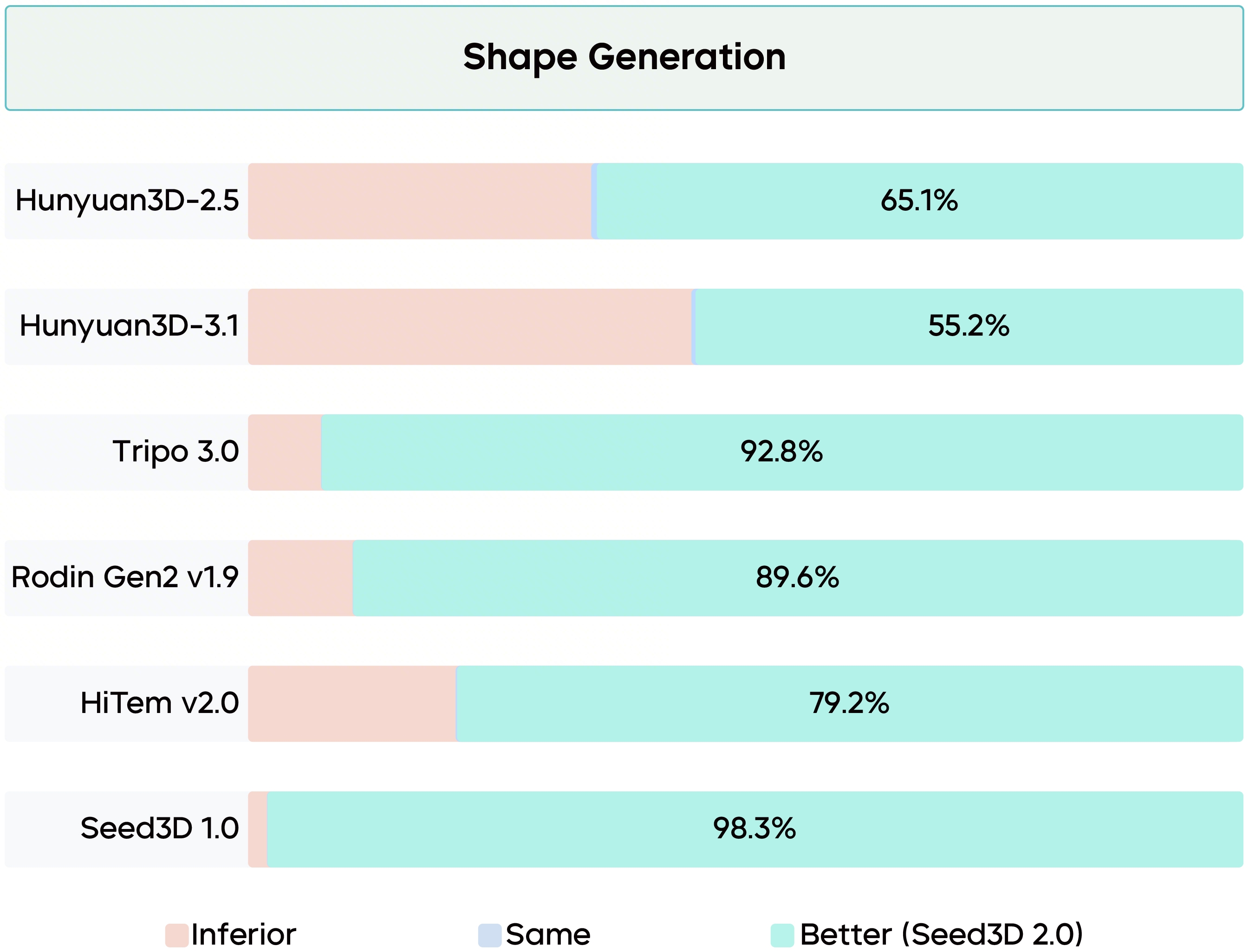 Furthermore, we recruited 60 evaluators with 3D modeling experience to conduct blind pairwise comparisons of generation quality between Seed3D 2.0 and 6 baseline models across approximately 200 test cases. In comparative tests of geometry generation, Seed3D 2.0 demonstrated a clear advantage, achieving a higher preference rate (the percentage of cases in which evaluators rated its generation quality as superior) compared to all other 3D generative models. This validates the geometric quality improvements enabled by our architectural innovations.