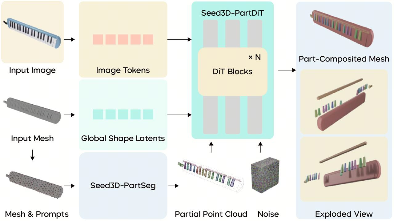 First, by collecting and annotating extensive specific segmentation data, Seed3D 2.0 learns how to partition 3D data based on functional dimensions and other criteria. We trained the Seed3D-PartSeg 3D comprehension module to perform surface segmentation on full 3D meshes. Building on this, Seed3D-PartDiT utilizes global 3D shape, segmented point clouds, and images as inputs to train the generative network, ultimately completing the surface segmentation results and assembling them into full part-level meshes.