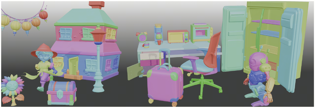As shown in the figure, a chair is automatically decomposed into a seat, backrest, and base, while a robot was also meticulously disassembled by body parts such as limbs to facilitate detailed structural analysis and performance evaluation. This part-level representation establishes a critical foundation for subsequent high-precision interactions.