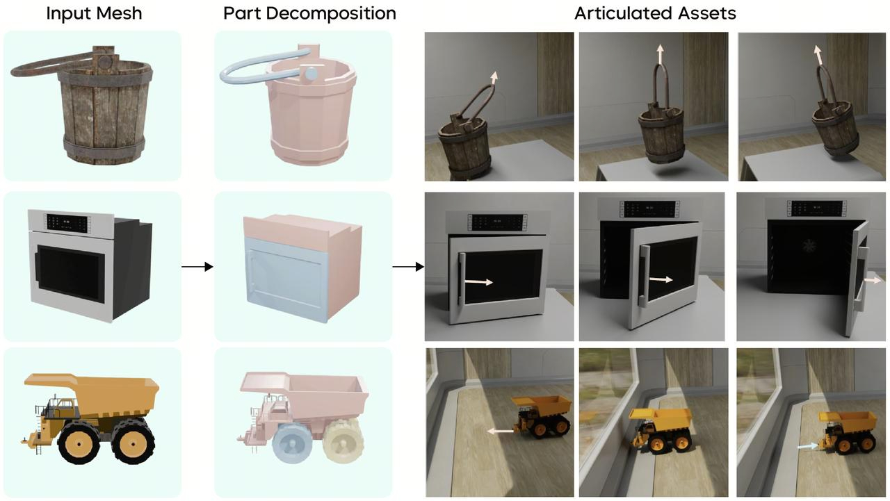 This process integrates multimodal understanding and generation technologies. The model first leverages VLMs to decompose parts into kinematic components and identify joint types (e.g., revolute parts vs. fixed structures), and then estimates joint axes via geometric priors. To ensure the physical plausibility of the motion, the model also introduces an image-to-video model to generate motion references, optimizing the range of motion for articulated parts. Ultimately, the model outputs 3D content with complete joint information in standard formats like URDF, achieving compatibility with mainstream physics simulation engines such as Isaac Sim.