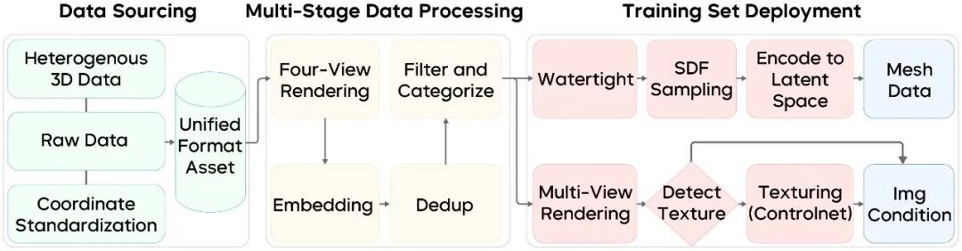 3D 数据的复杂性和多样性是训练中的首要挑战。如下图所示,Seed3D 1.0 构建了完整的三阶段数据处理管线,将海量异构的原始 3D 数据转化为高质量训练集。