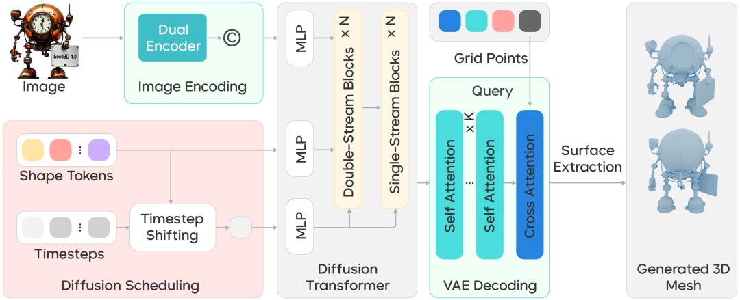 Seed3D 1.0 采用生成式 AI 广泛应用的模型架构 Diffusion Transformer,来设计 3D 几何生成和纹理贴图模型。