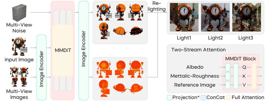 除了精细的几何结构,纹理贴图也是保证 3D 生成视觉效果和多样性的关键。如下图所示,Seed3D 1.0 基于多模态 Diffusion Transformer 架构,构建了多视角图片生成模型。模型输入参考图片和 3D 几何渲染图,输出多视角一致的纹理图像。
